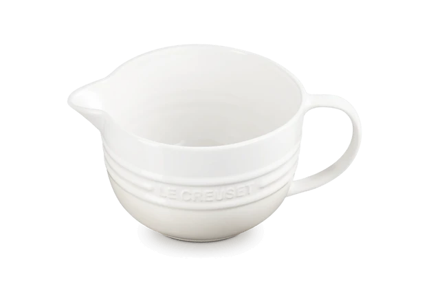 De ronde beslagkom van Le Creuset is gemaakt van crème geglazuurd aardewerk en heeft een diameter van 18,3 cm en een inhoud van 2 liter. De beslagkom heeft inclusief de greep een lengte van 26,1 cm. Gebruik de kom voor het mengen van beslag.