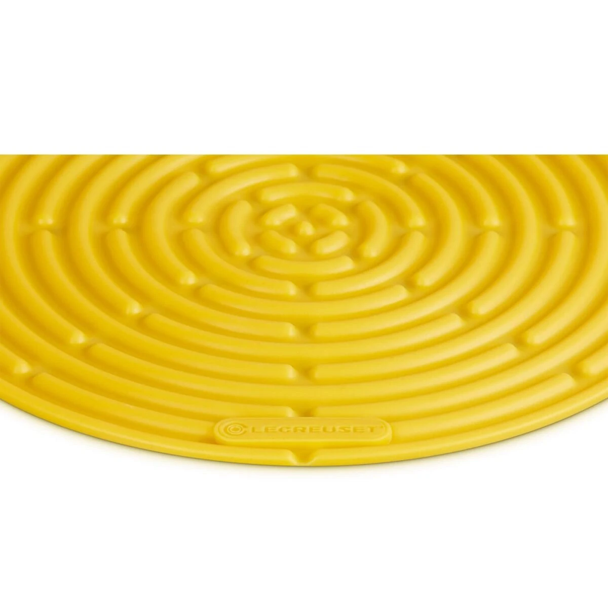 De ronde Le Creuset onderzetter is gemaakt van Nectar, geel silicone en heeft een diameter van 20 cm. Gebruik de flexibele lap als onderzetter of als pannenlap. De onderzetter is voorzien van een cirkelpatroon.