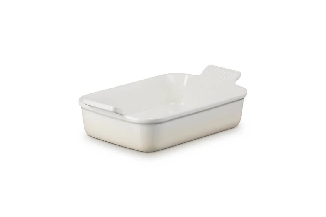 De Le Creuset rechthoekige ovenschaal is gemaakt van Meringue, crèmekleurig, geglazuurd aardewerk. Het geglazuurde oppervlak is kras- en vlekbestendig en geur- en smaakneutraal. De ovenschaal is 26 cm lang en 19 cm breed. Inclusief de grepen is de schaal 32,7 cm lang, 20,3 cm breed en 8,9 cm hoog. Voor het bereiden van bijvoorbeeld ovenschotels voor 4 tot 6 personen.