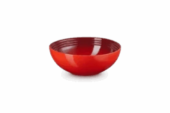 De ronde schaal van Le Creuset is gemaakt van kersrood geglazuurd aardewerk. De diameter van de schaal is 24 cm en heeft een inhoud van 2,2 liter. Gebruik de schaal om bijvoorbeeld een salade in te serveren.